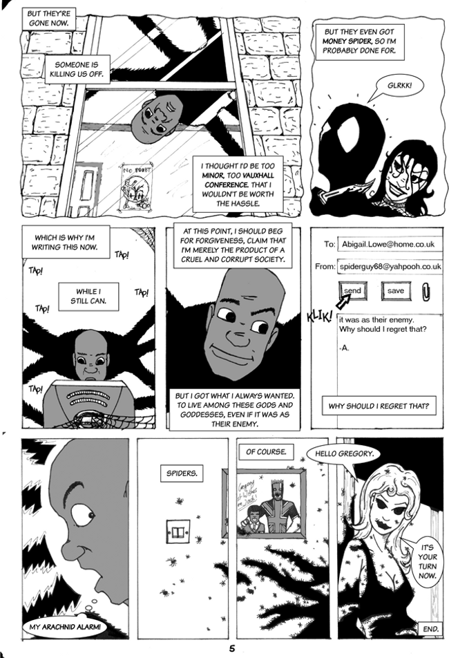 Martin Eden's superhero story The O Men is one of my favourite superhero comics, a self-published title that somehow manages to outdo many "professional" efforts. In the nineteenth issue of the series, Martin introduced and killed off, all in the space of one page, a villain called Arachnid. Arachnid was human from the neck up, and a nasty black spider from the neck down, and even though he only really appeared once, I was quite taken by the way the character was presented.
